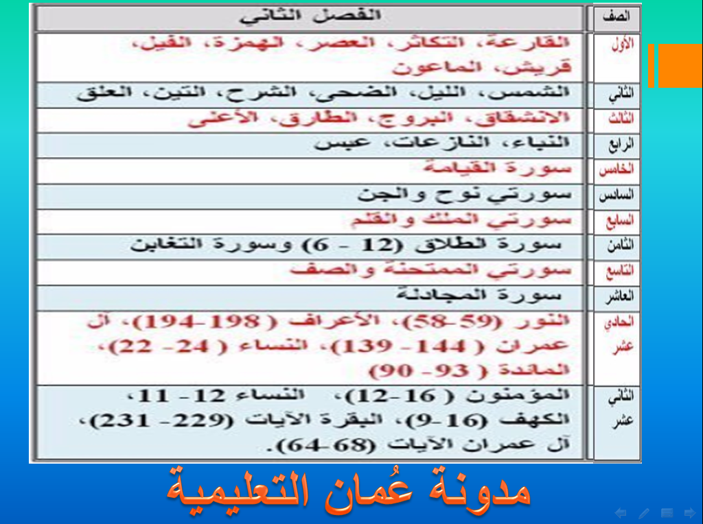 مقررات الحفظ و التلاوة لمادة التربية الاسلامية من صفوف 1 12 الفصل الثاني