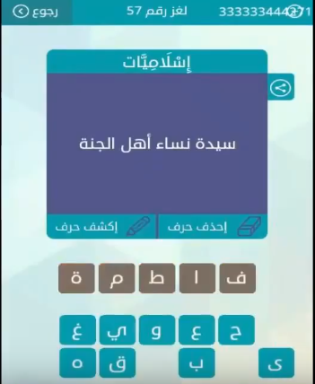 جواب لغز سيدة نساء اهل الجنة من لعبة وصلة المجموعة السابعة لغز رقم 57 صقور الإبدآع