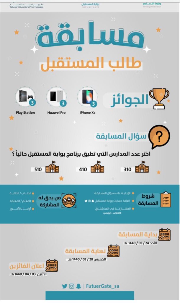 بوابة المستقبل تعليم القصيم On Twitter يمكنكم الآن المشاركة بمسابقة طالب بوابة المستقبل من خلال حسابكم بالبوابة وفق الشروط المذكورة في الصورة والفوز بأحد الجوائز المسابقة متاحة لـ المعلمين و أولياء الأمور و الطالب الرقمي Https T Co Xrodnlof82