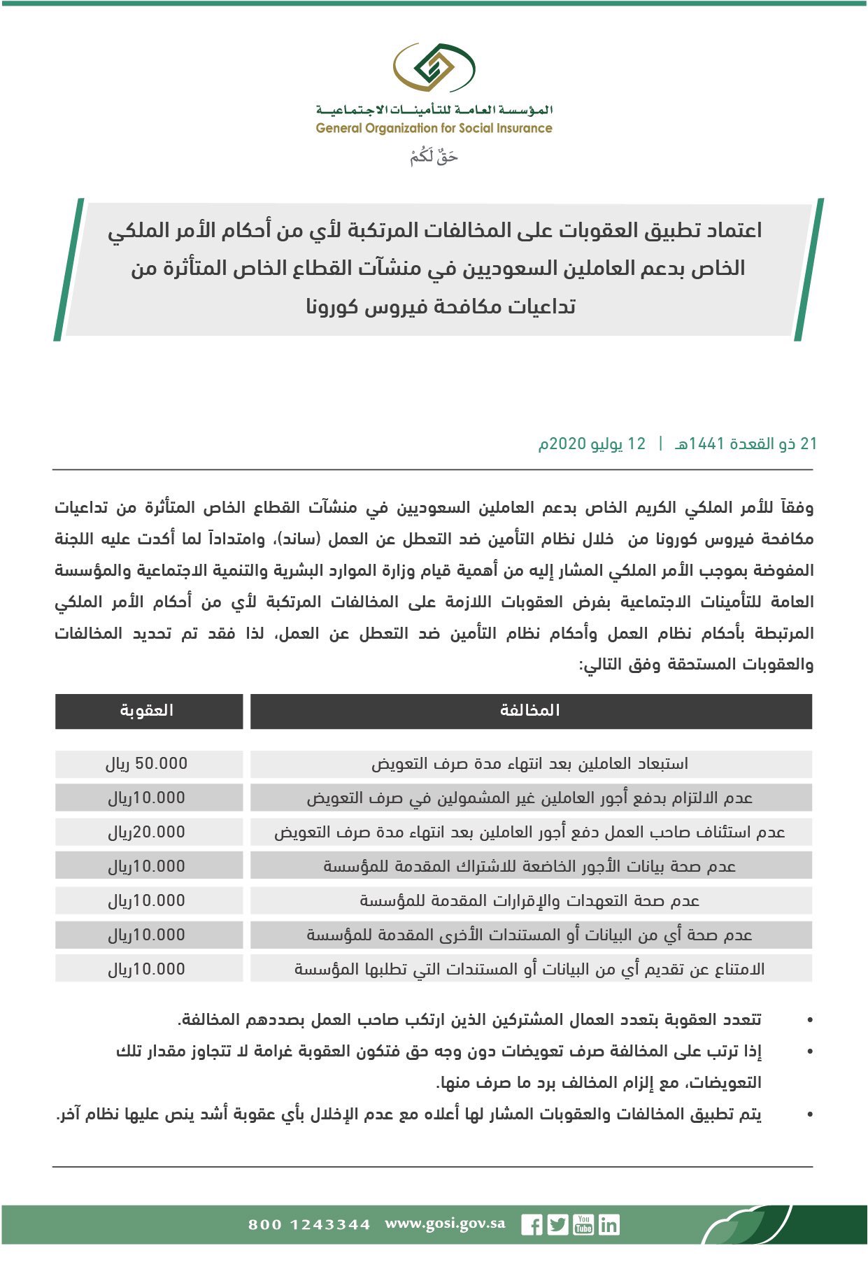 إتمام للخدمات On Twitter تنويه اعتمدت التأمينات الإجتماعية تطبيق العقوبات على المخالفات المرتكبة لأي من أحكام الأمر الملكي الخاص بدعم العاملين السعوديين في منشآت القطاع الخاص المتأثرة من تداعيات مكافحة فيروس كورونا