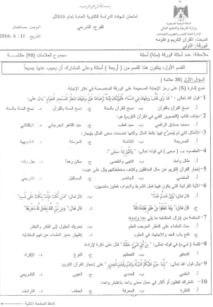 امتحان القرآن الكريم وعلومه ورقة أولى توجيهي شرعي 2016 المكتبة الفلسطينية الشاملة