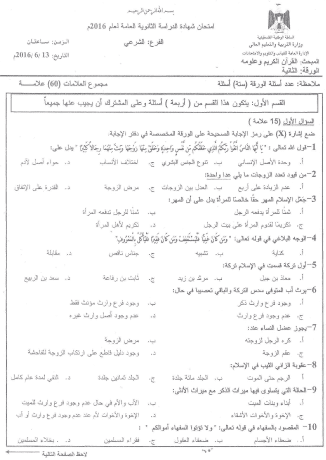 امتحان القرآن الكريم وعلومه ورقة ثانية توجيهي شرعي 2016 المكتبة الفلسطينية الشاملة