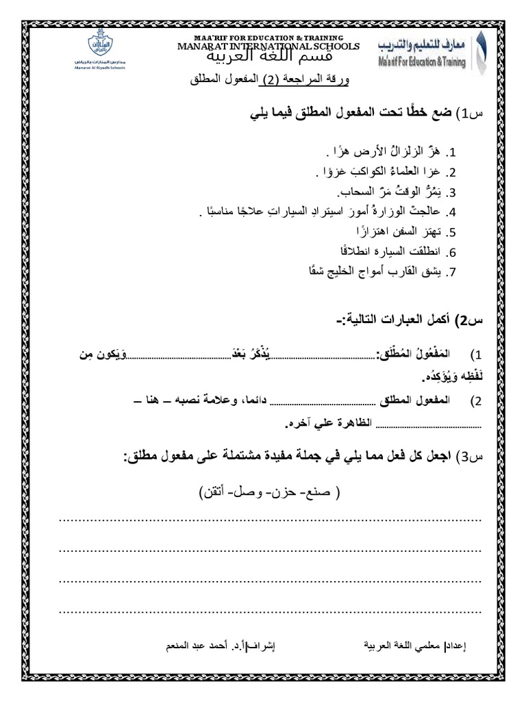 متابعى موقع مدرسة الامارات ننشر لكم ورقة عمل درس المفعول المطلق مادة اللغة العربية للصف السادس الفصل الدراسى الأول 2019 2020 Math Arabic Worksheets Worksheets