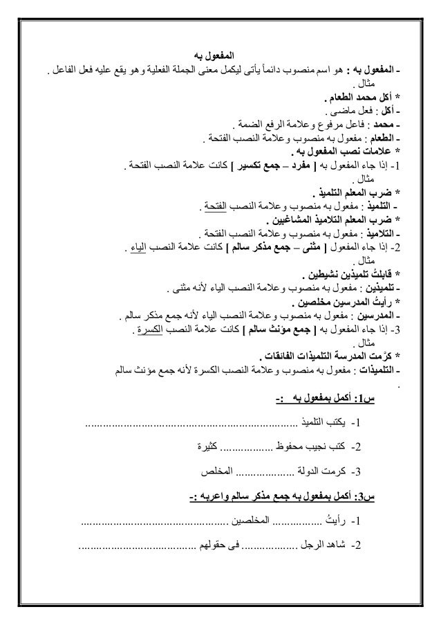 لطلاب الصف التاسع والثامن ورقة عمل عن درس المفعول به ي رجى قراءتها جيدا وعمل إشارة لزملائكم مع أطيب التمنيات بالتوفيق
